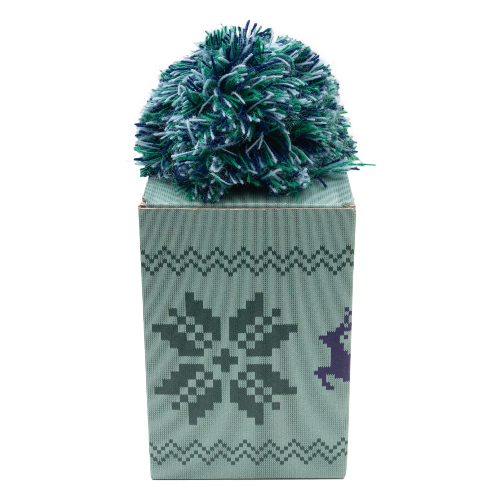 A unique gift pack in the shape of a Christmas tree with the pom of the beanie sticking through the top. Perfect as a surprising winter gift or eye-catching corporate gift.