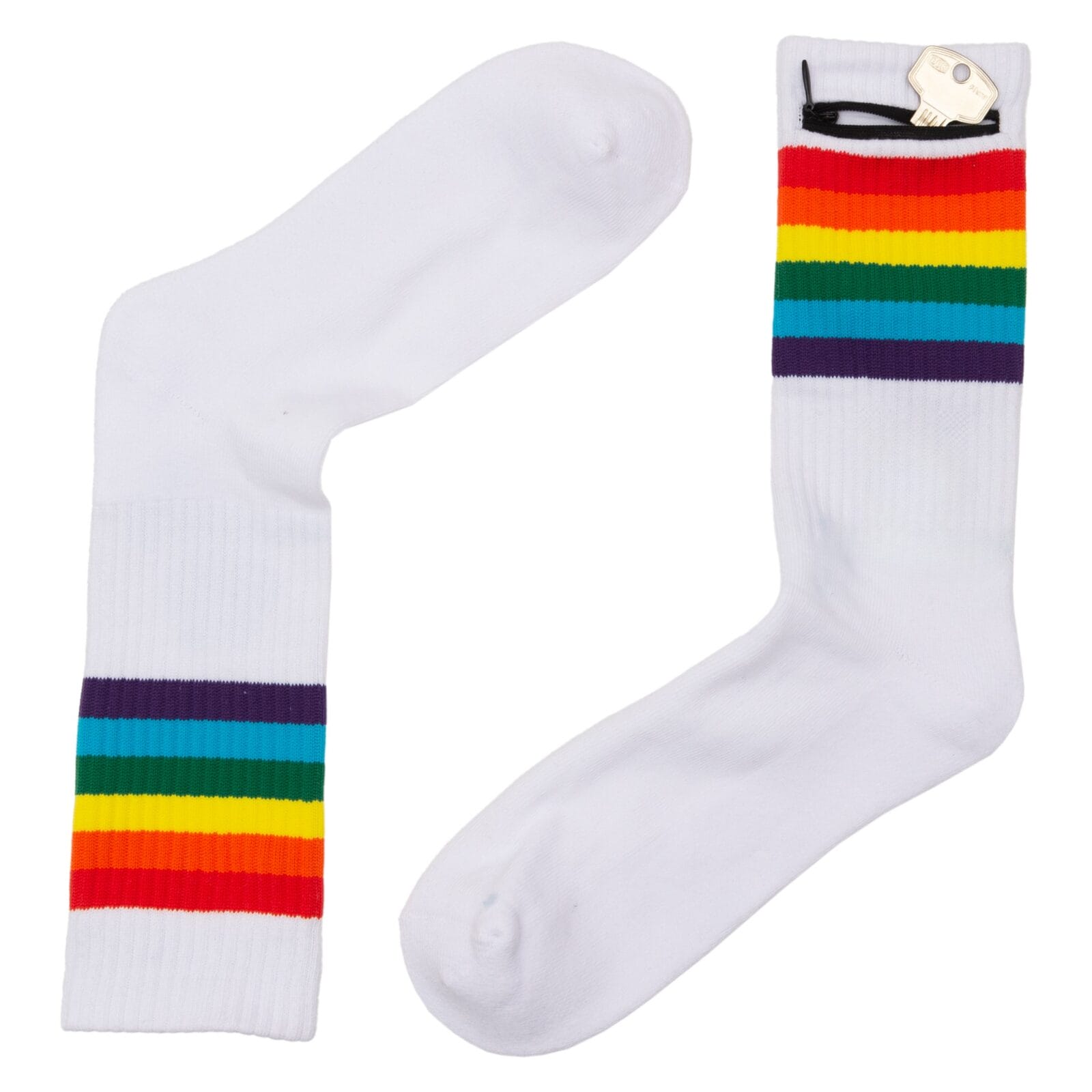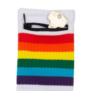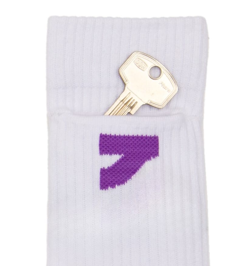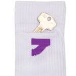 Sports sock with integrated pocket or zipper for key or card - useful for running and events. Breathable and supportive design with performance zones. Branding possible in own colors, in the knitted fabric or own color zipper