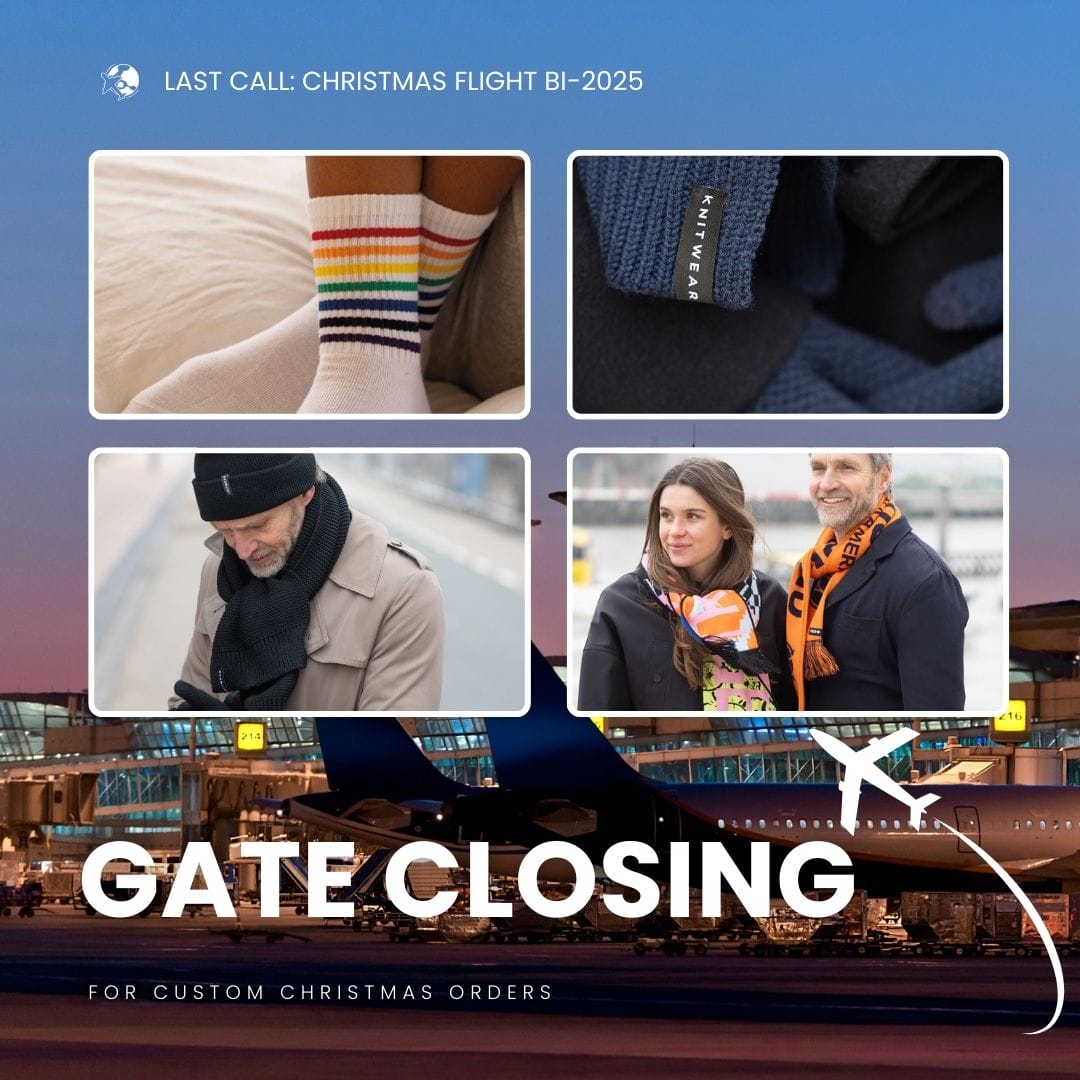 Order our custom beanies, scarves, gloves and socks now, before the gate closes for guaranteed December delivery.